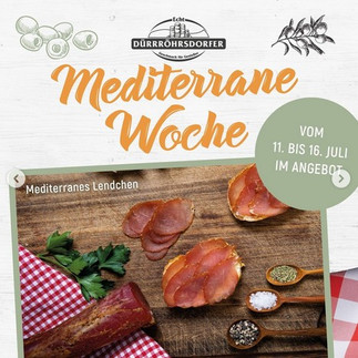 Mediterranes Lendchen, Mediterrane Teewurst, mediterran gewürzte Hackbällchen, unsere Hähnchenbrustfilets in mediterraner Marinade und unser mediterran gefülltes Pollo-Fino. Ob zur Brotzeit, auf dem Grill oder als Snack zwischendurch - die ganze Woche, in allen Filialen und nur solange der Vorrat reicht!