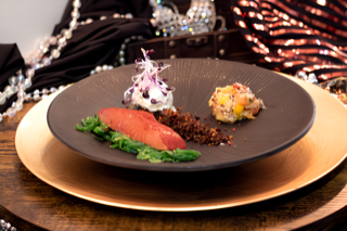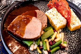 Der Hauptgang ist eine Hommage an unsere verstorbene Senior- Prinzipalin Ingrid Stosch- Sarrasani und eines ihrer Lieblingsgerichte, ein Boeuf la Motte von der Rindersemerrolle mit Burgundersoße und Bohnen, zeitgemäß von einem Süßkartoffel- Birnen- Gratin begleitet. Dazu passt der Rotwein „Sächsisches Gezwitscher“ vom Weingut Matyas in Coswig besonders gut, da dieses Weingut wie Sarrasani auch ein inhabergeführtes Privatunternehmen ist und ebenfalls hohe Qualitätsansprüche hat. Sarrasani fühlt sich als ein international aufgestelltes Unternehmen mit Dresdner Wurzeln, die weit über ein Jahrhundert zurück reichen einem lokalen Netzwerk von Partnern verbunden. So kommt unsere Überraschung der Vorspeise, das Gurken- Wacholder- Eis zum rotholzgeräucherten Lachs, von der Eis- Manufaktur Neumann in Dresden, die Säfte der Getränkekarte von René Linke aus der Oberlausitz und das Bier aus der Privatbrauerei Landskron in Görlitz.