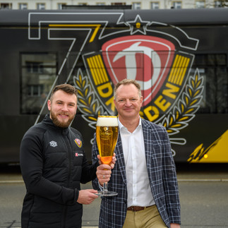 Am heutigen Freitag, 31. März 2023 weihte die Radeberger Exportbierbrauerei gemeinsam mit der SG Dynamo Dresden den im Partnerlook gestalteten Niederflurgelenktriebwagen der DVB AG im Herzen Dresdens, an der Wallstraße ein. Feierlicher Anlass war der bevorstehende 70. Geburtstag der SGD am 12. April 2023.